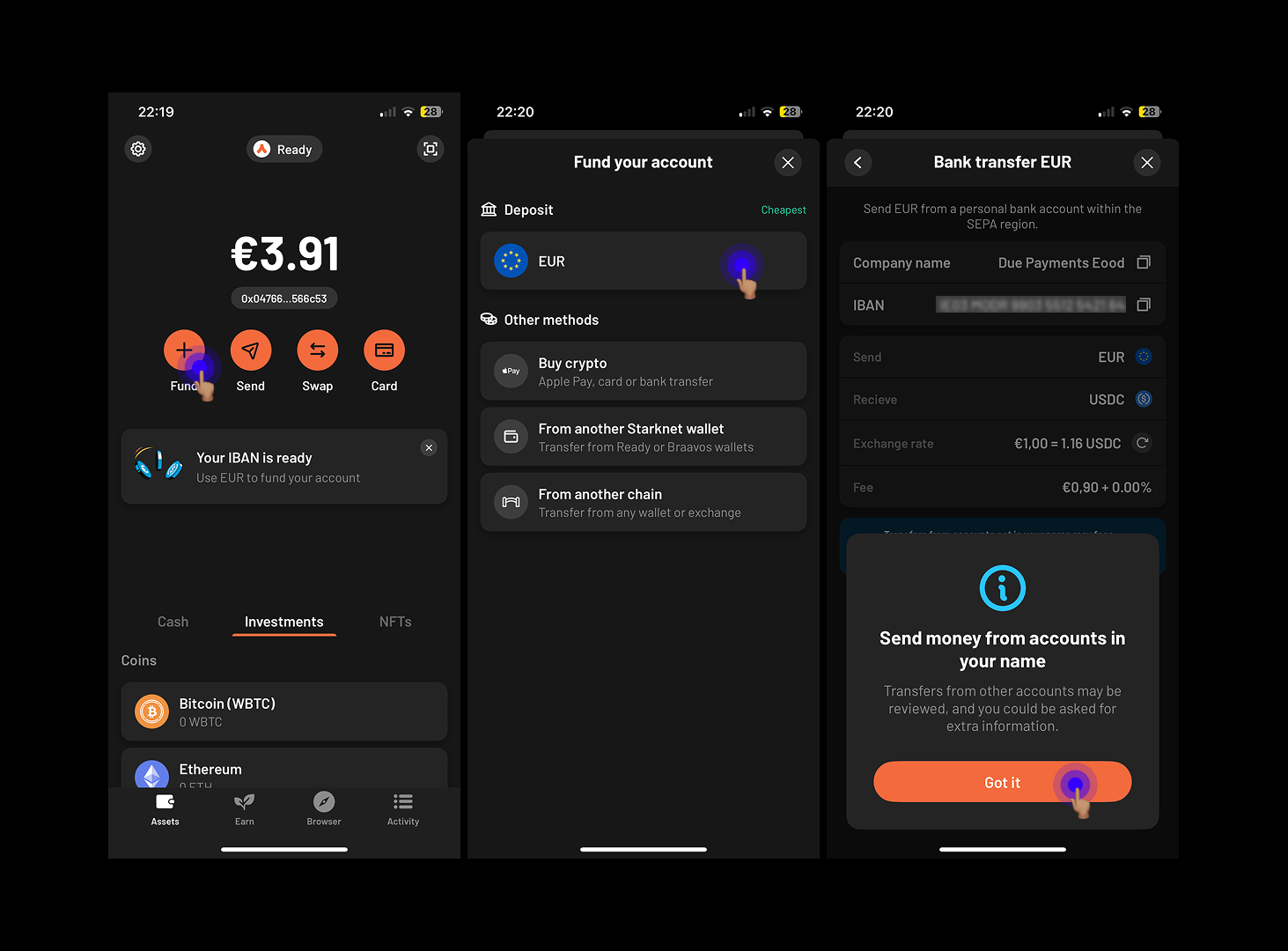 Then you’ll be able to send fiat from your regular bank to the bank details provided by Ready.